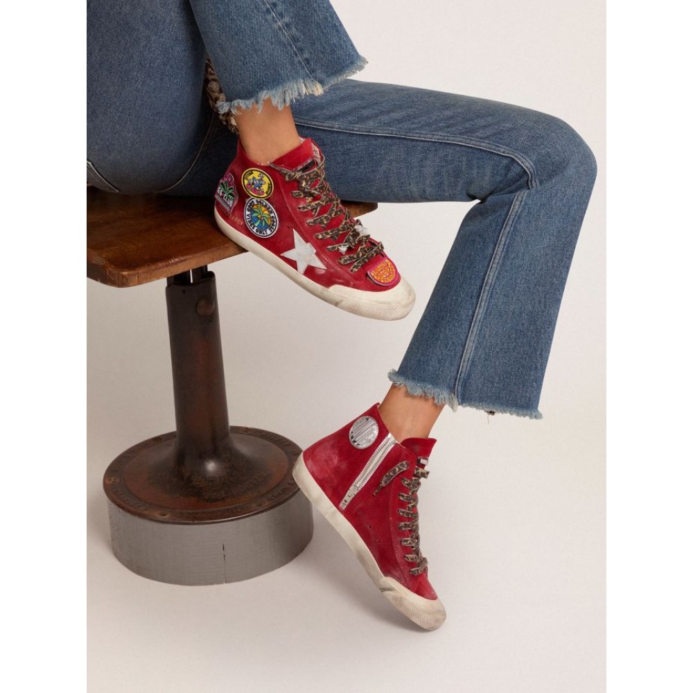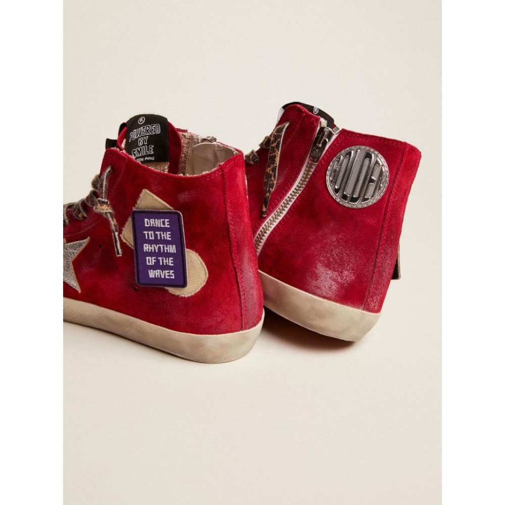 The Seventies, today: inspired by the world of basketball, the style of the Francy sneakers is updated with unexpected details and special finishes. This red suede model features detachable multicolored patches and a silver laminated leather star. And the beige and brown leopard-print laces add the finishing touch.