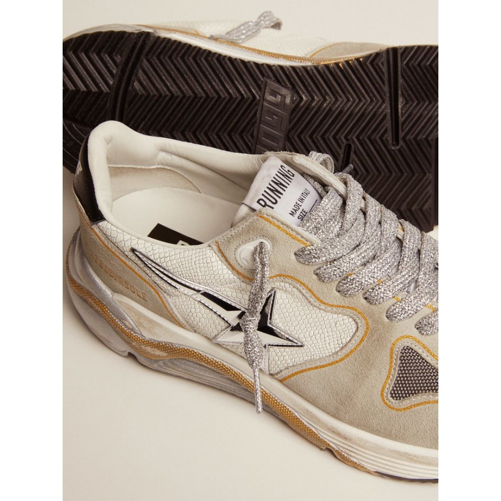 Urban style and a spirit of craftsmanship are combined in our Running Sole sneakers: the ideal companion for your metropolitan adventures. This model features a white snake-print leather and ice-gray suede upper with mesh insert on the toe. And the silver 3D star adds the finishing touch.