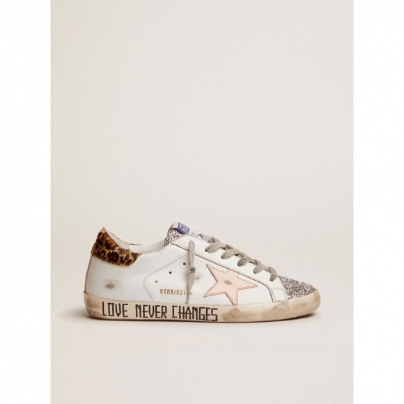 A timeless icon yet one that's constantly evolving. At Golden, we love taking our classics and reworking them all the time, always from a new angle. These white leather Super-Star sneakers feature a silver glitter tongue and leopard-print pony skin heel
