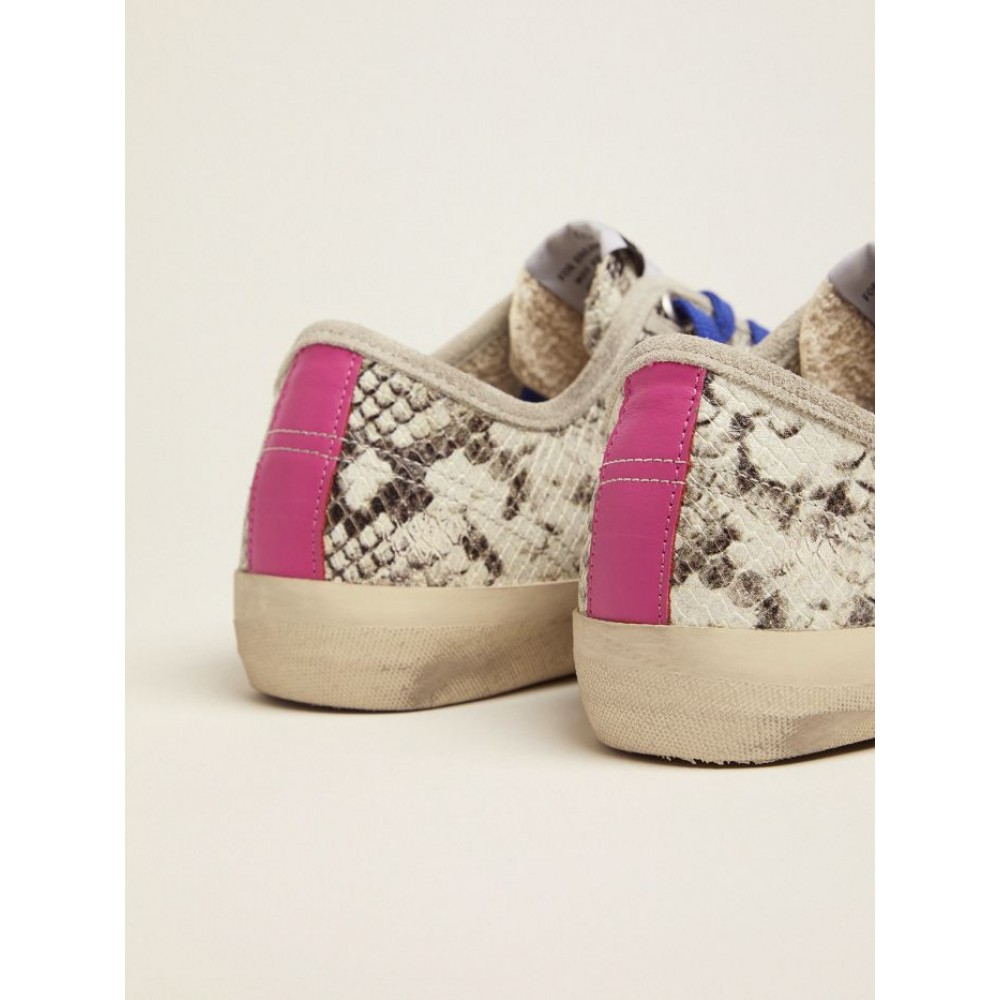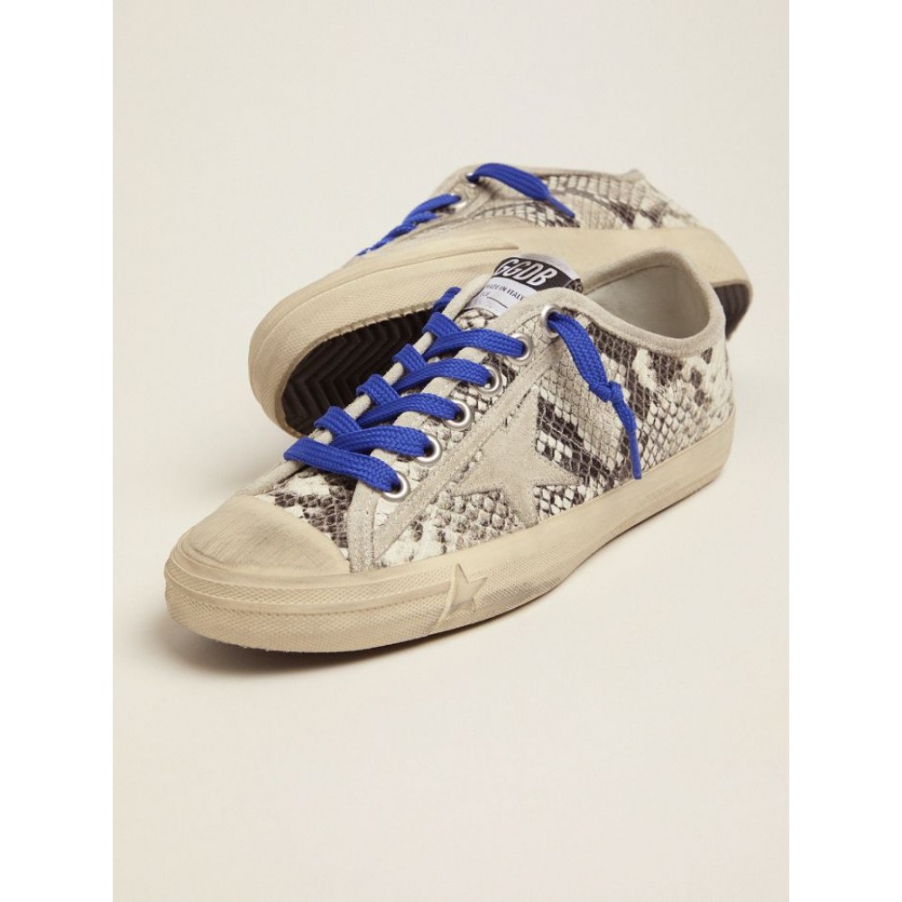 The iconic, timeless design of these sneakers is updated in a contemporary key. V-Stars are inspired by 1970s basketball, boasting a minimalist silhouette with rubber toecap. We have enhanced this model thanks to the snake-print leather upper, blended with the fuchsia vertical strip on the back and blue laces.